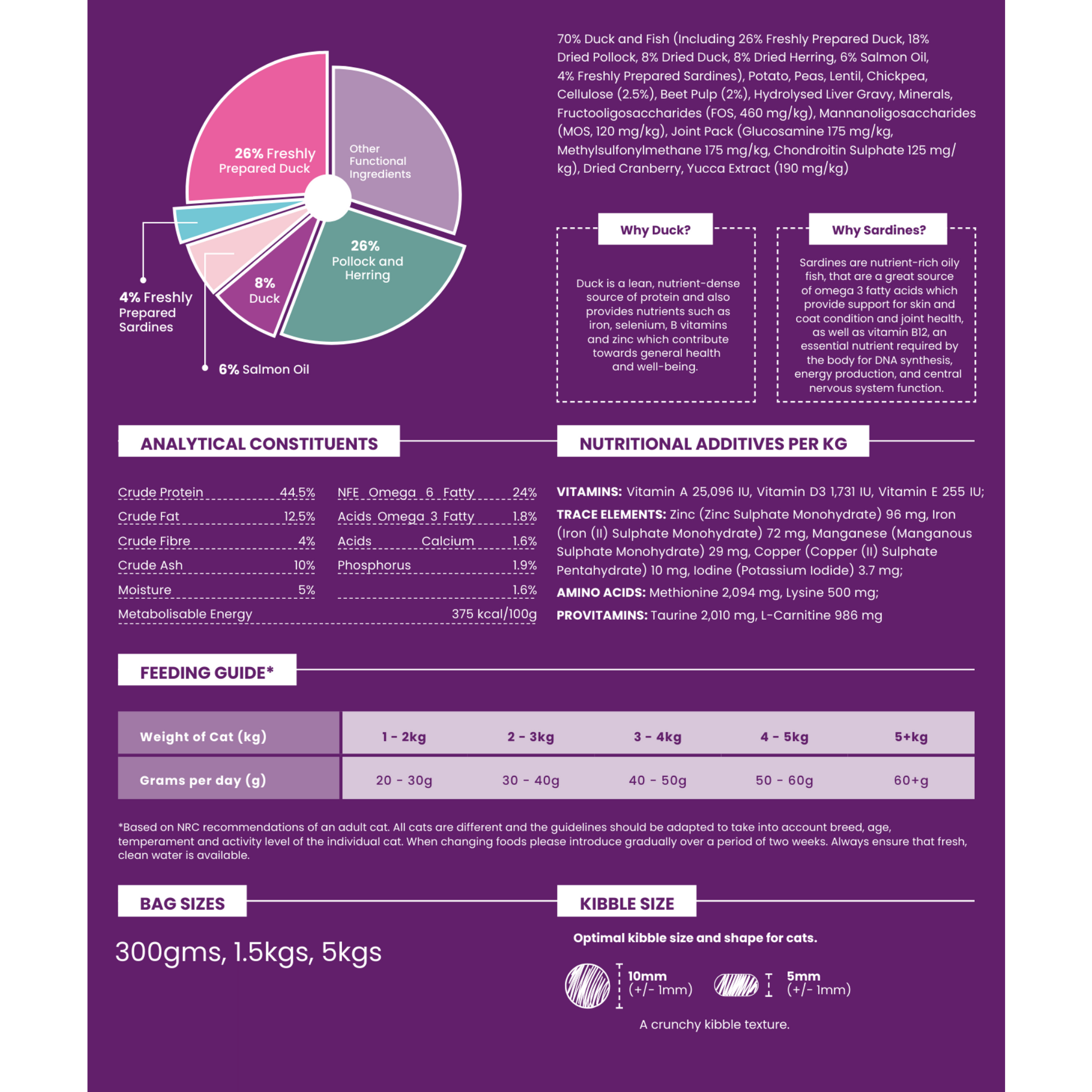 Analytical Constituents: Crude Protein 44.5%, Crude Fat 12.5%, Crude Fibre 4%, Crude Ash 10%, Moisture 5%, NFE 24%, Omega 6 Fatty Acids 1.8%, Omega 3 Fatty Acids 1.6%, Calcium 1.9%, Phosphorus 1.6%, Metabolisable Energy 375 kcal/100g